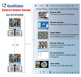 Remote DVR Configuration: Full control of local DVR settings - Remote Desktop: Remote access to local DVR desktop - Matrix View: Remotely monitor, record and playback from 1000 hosts - Remote ViewLog: Playback of recorded videos from local GV-Systems - I/O Central Panel: Group, manage and remotely configure I/O devices - Video Wall (optional)